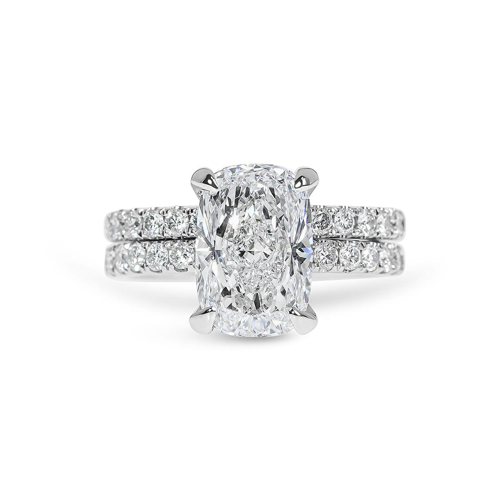 Four-prong Cushion Cut design with a hidden halo and side diamonds set three-quarters around a 2mm band.