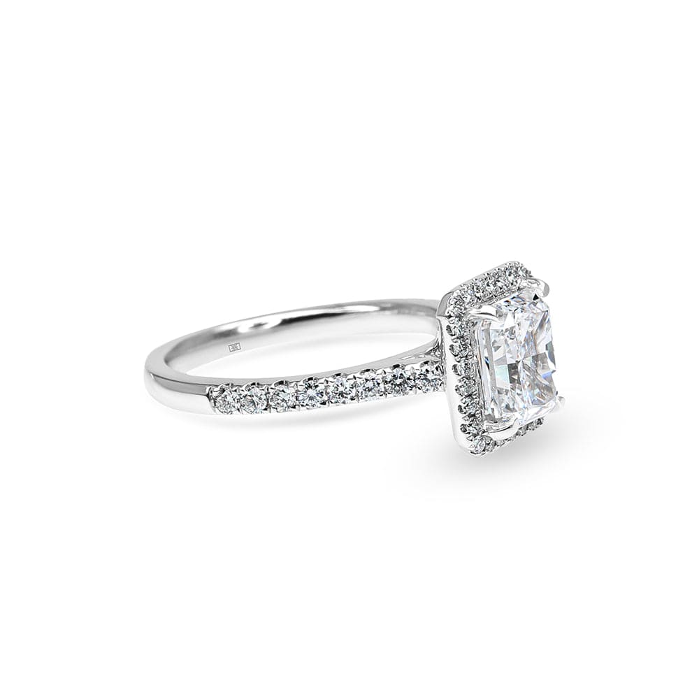 Radiant Cut design with a halo and side diamonds set along a 1.9mm band.