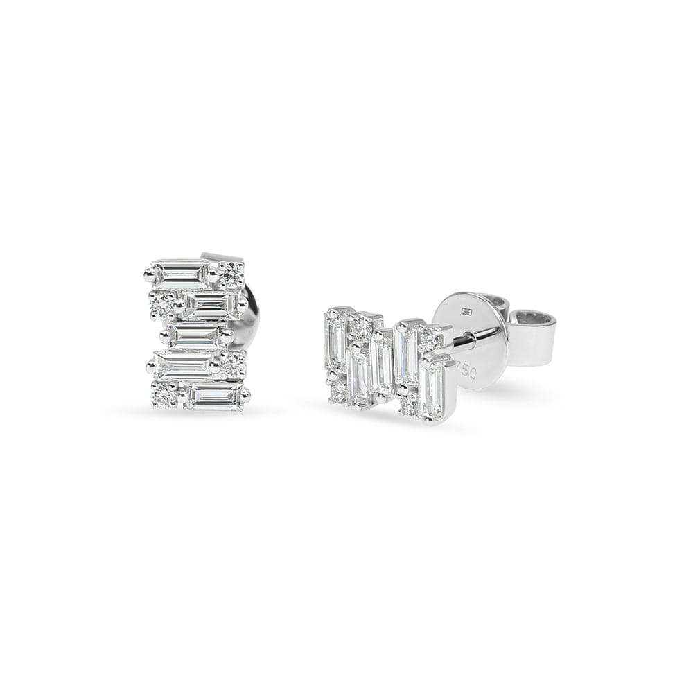 Baguette diamond earrings are a type of jewelry featuring baguette-cut diamonds. Baguette-cut refers to a specific diamond shape that is rectangular or elongated with step-like facets. The name "baguette" is derived from the French word for "stick" or "rod," reflecting the shape of the diamond. Baguette diamond earrings typically feature multiple baguette-cut diamonds set in a row or cluster. The diamonds are often arranged in a linear or geometric pattern, creating a sleek and elegant look. The earrings can be designed in various styles, including studs, hoops, dangles, or drop earrings.