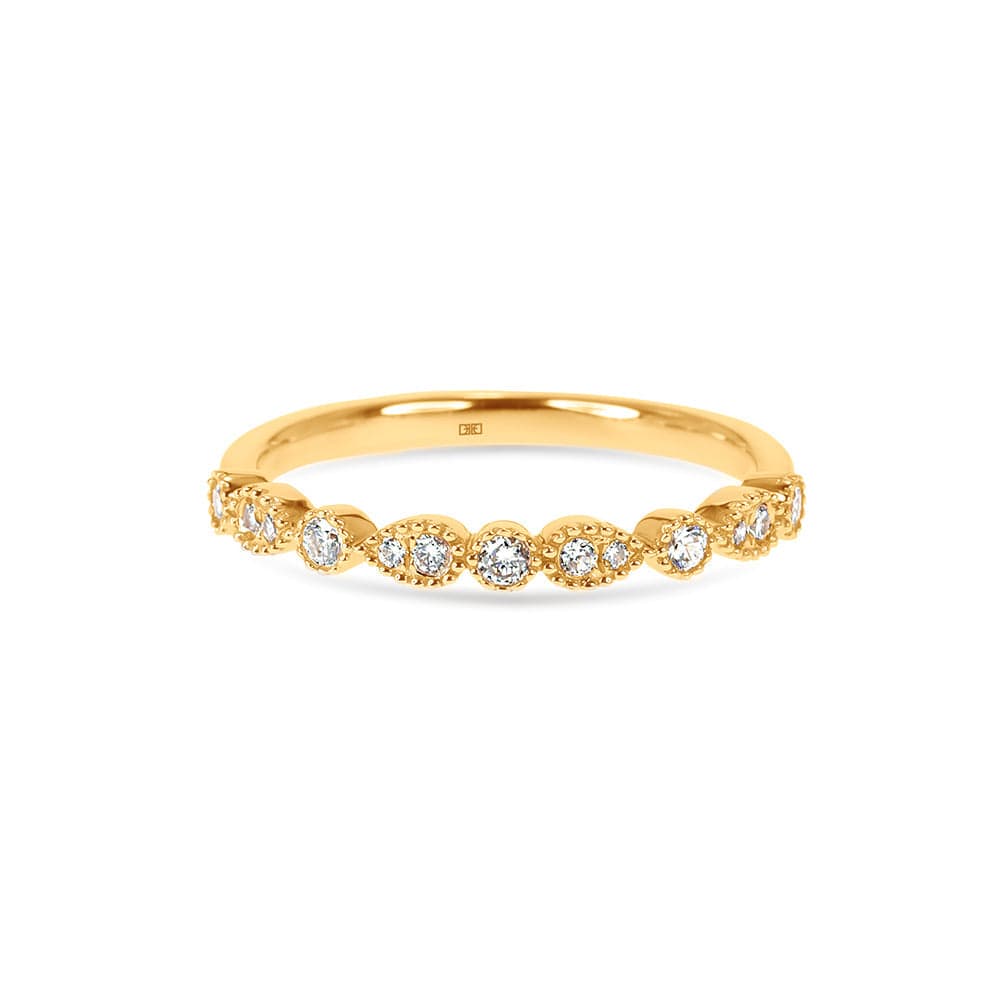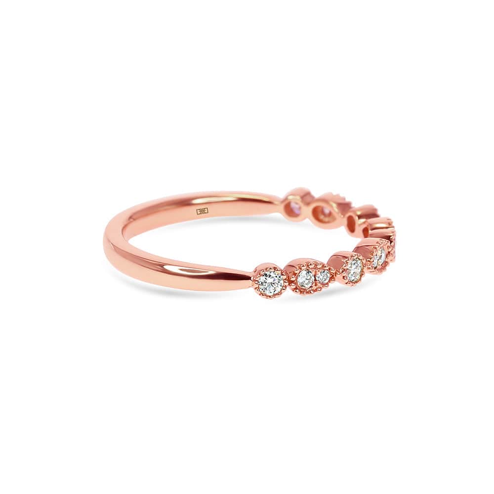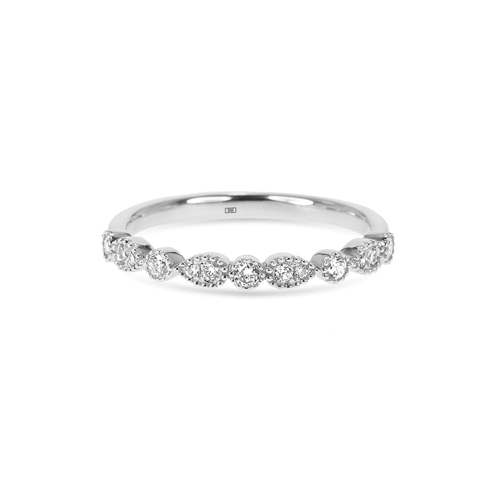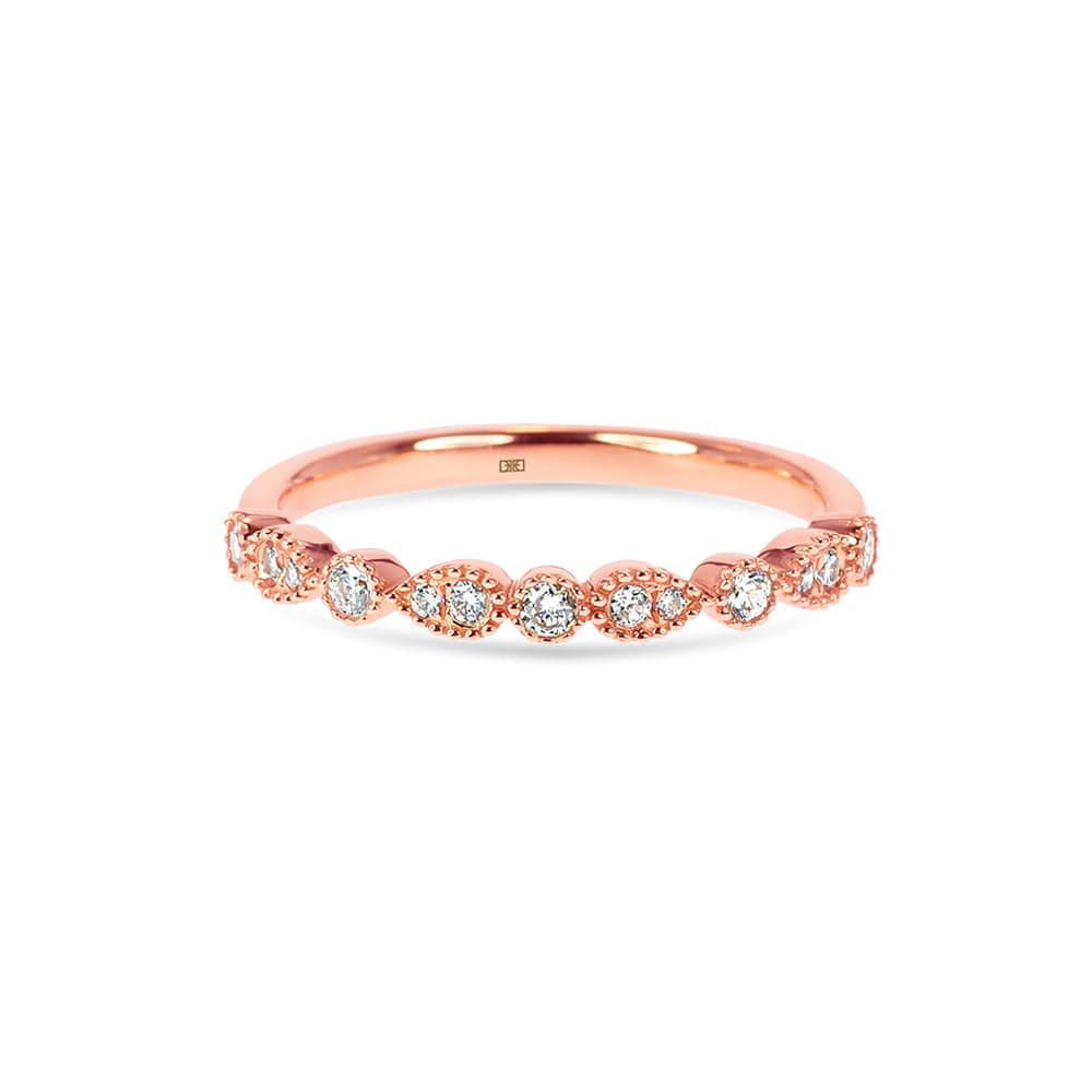 The Katrina diamond wedding band has a playful mix of pear and round shapes. The milgrain bead finishing gives off a vintage air, mixing modern with vintage elegance.