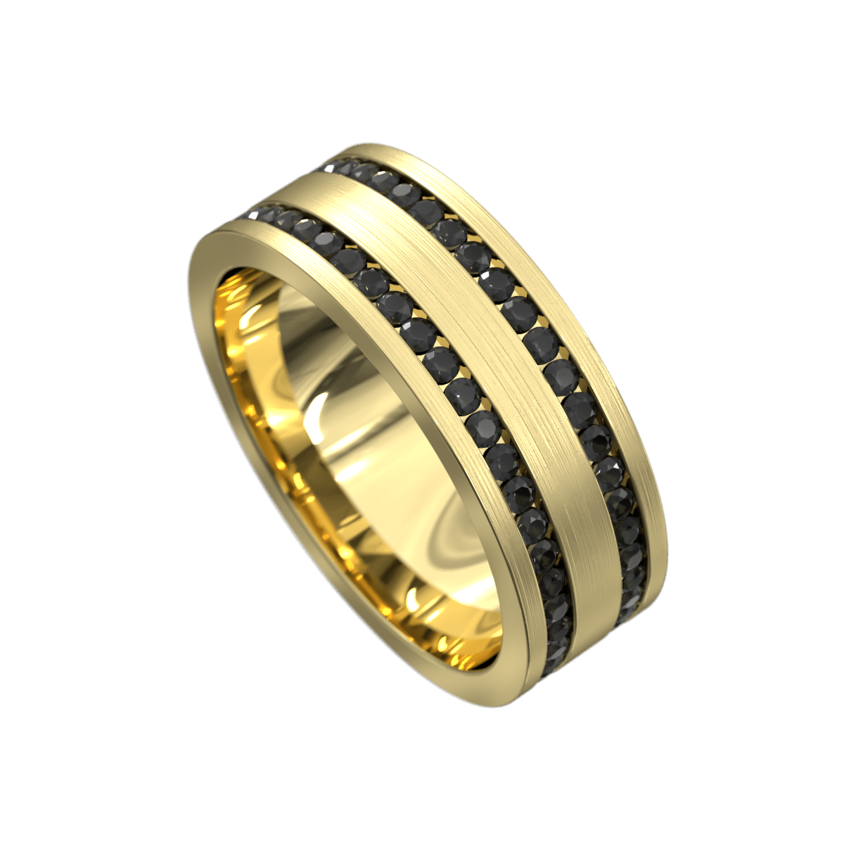 Make a statement with this bold wedding band. A brushed finish mens band with double side rows of channel set Natural Black Diamonds all around the band.