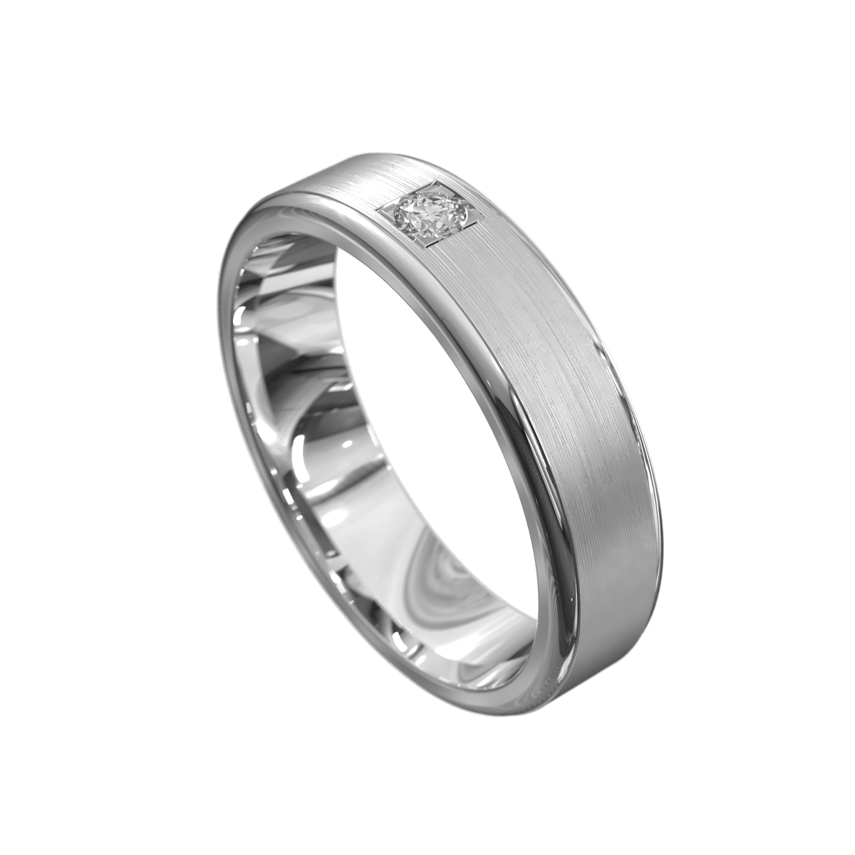 This diamond wedding band offers contemporary appeal with its brushed insert, brightly polished edges and studded with a single diamond for understated elegance.
