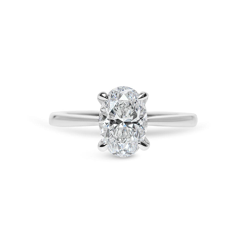 Embrace sophistication with our Four-Prong Oval Diamond Tapered Band Engagement Ring. The graceful Oval Diamond takes center stage, secured by four prongs atop a gently tapered band, promising a union of enduring elegance and contemporary style.