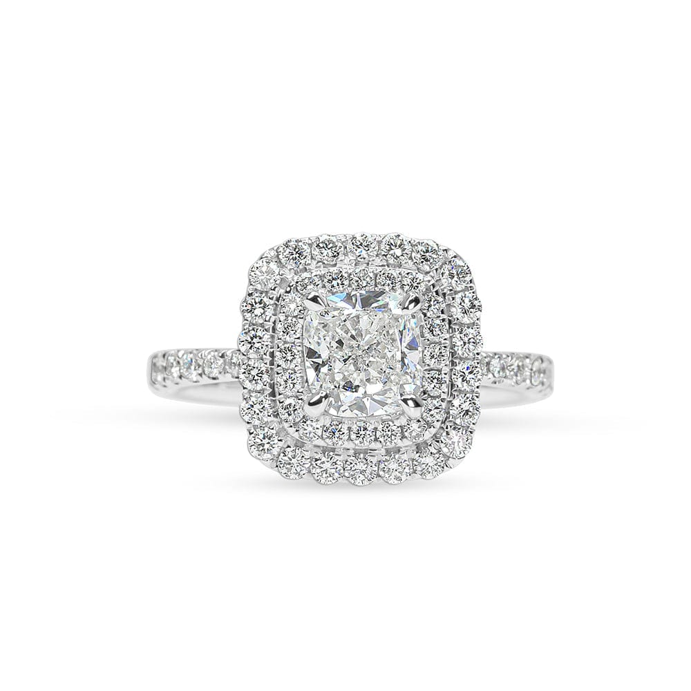 4 prong Cushion Cut Diamond & Double Halo with Sidestones Engagement Ring.