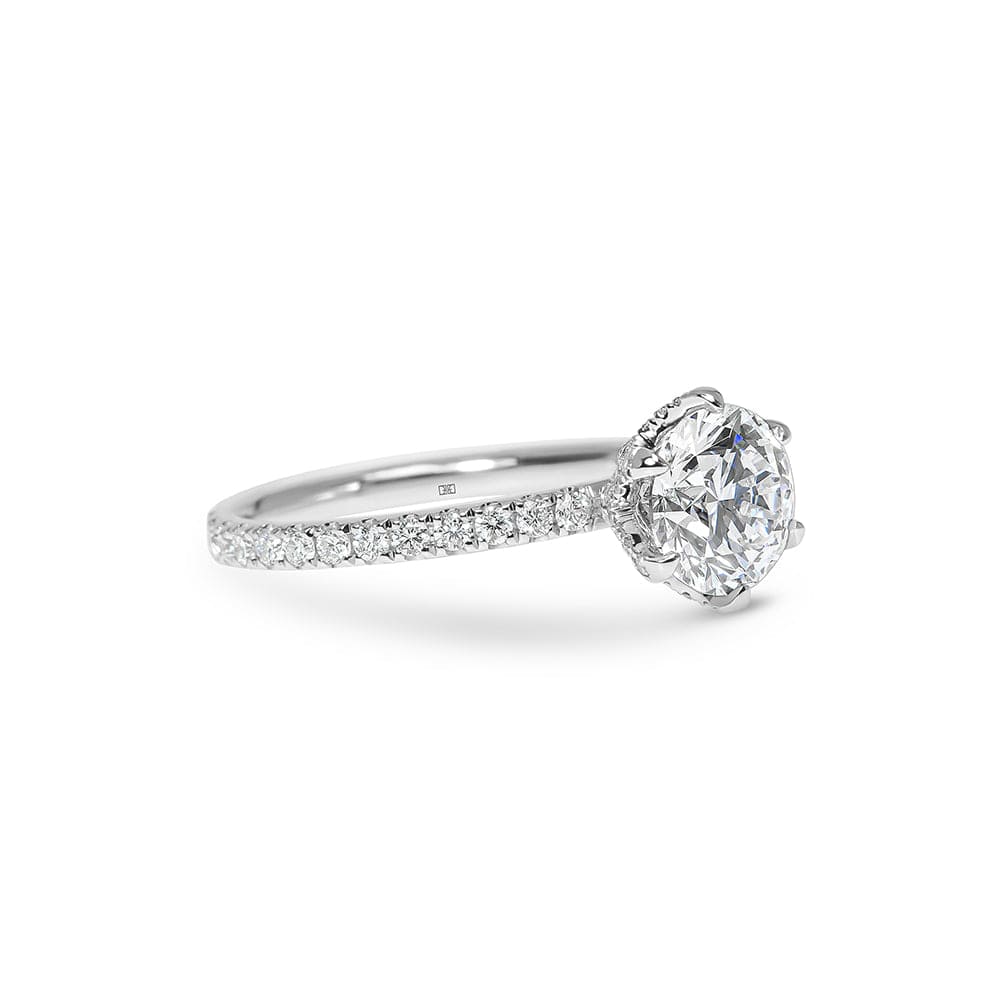 Diamond Encrusted Lotus Basket Round Brilliant Cut Diamond Engagement Ring, featuring a Diamond Basket and Sidestones. The central round diamond is cradled in a beautifully crafted diamond basket, surrounded by sparkling eternity sidestones, creating a dazzling display of contemporary elegance.