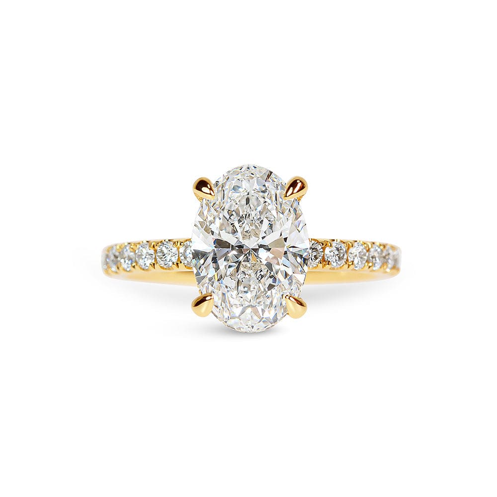 Discover timeless allure with our Oval Cut Diamond Engagement Ring. The centerpiece, a gracefully elongated oval diamond, is adorned with a dropped Hidden Halo and Eternity Sidestones, creating a symbol of everlasting love with a touch of classic refinement.