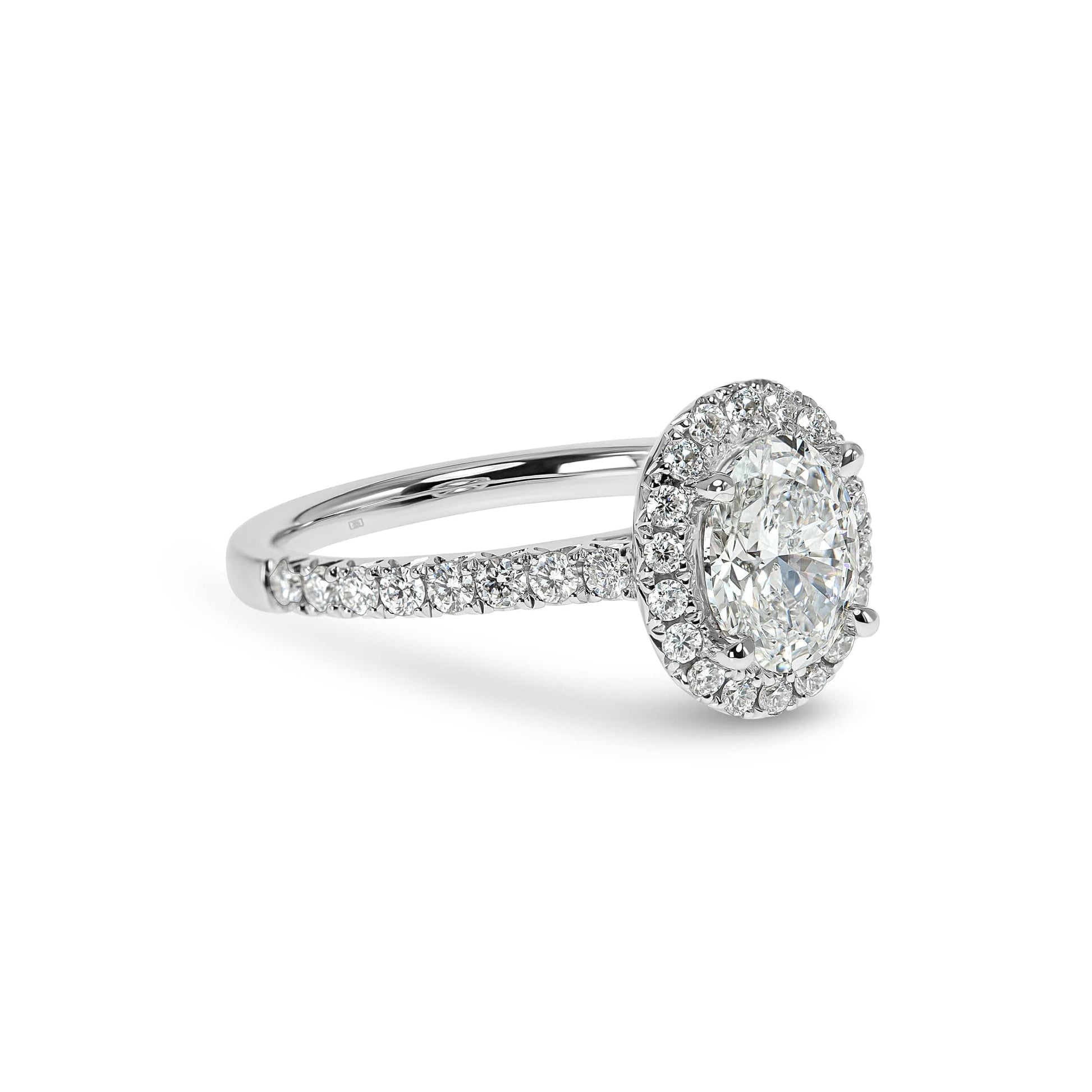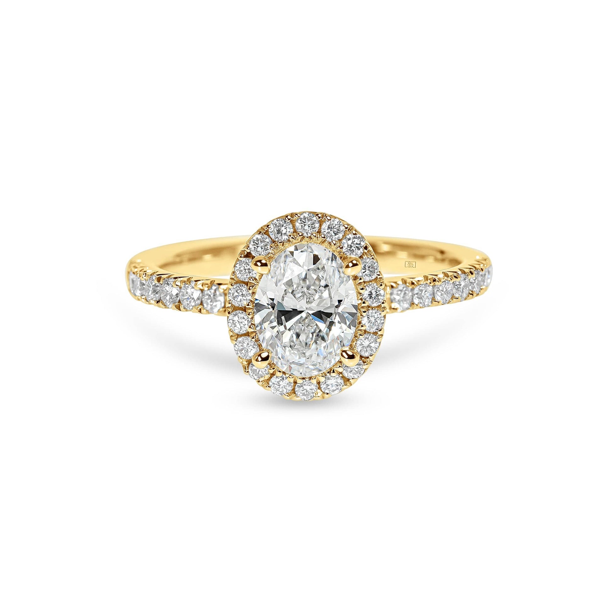 Lab Grown Oval Diamond Engagement Ring with Diamond Halo and pavé set diamonds on the band.